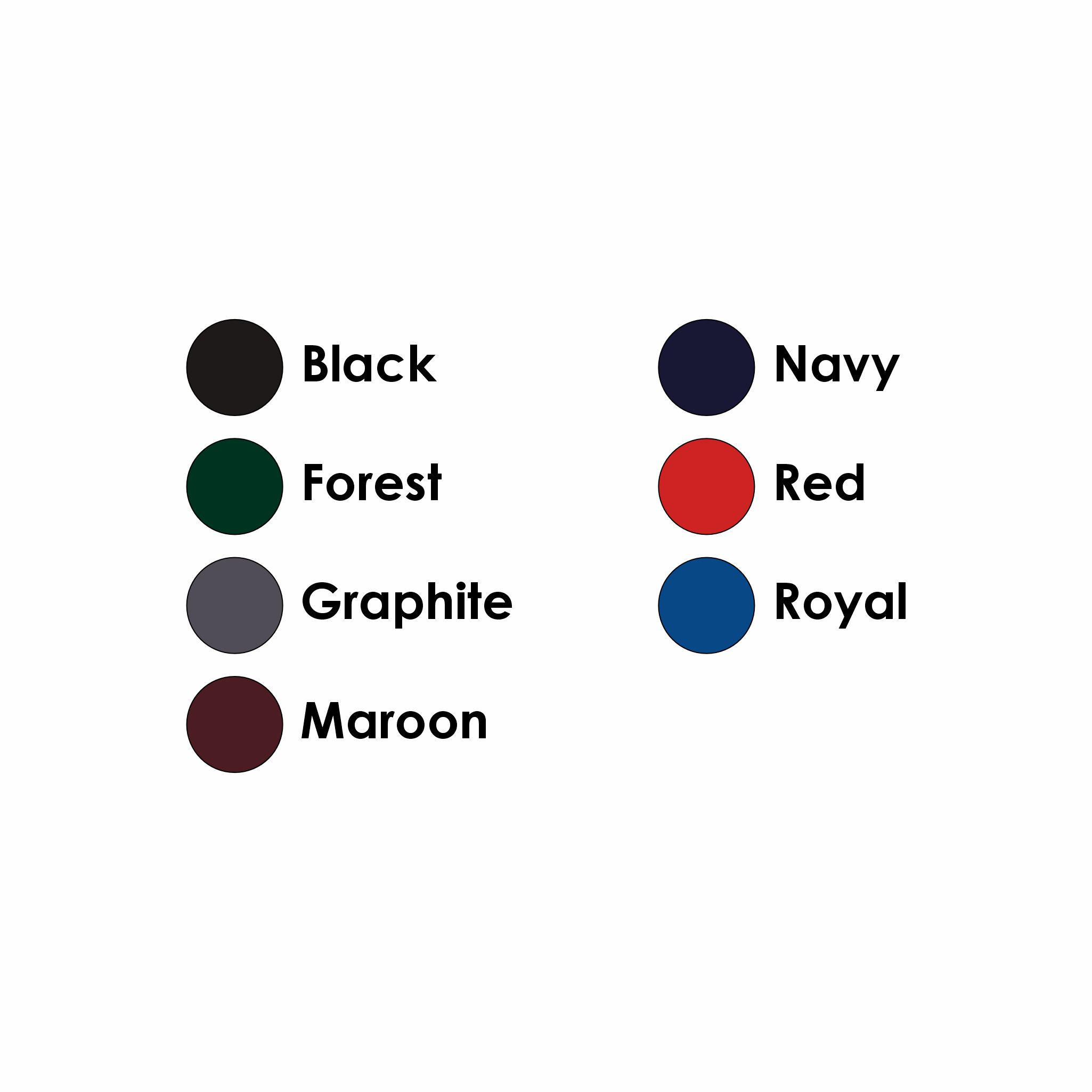 Black, Graphite, Maroon, Navy, Red, Royal